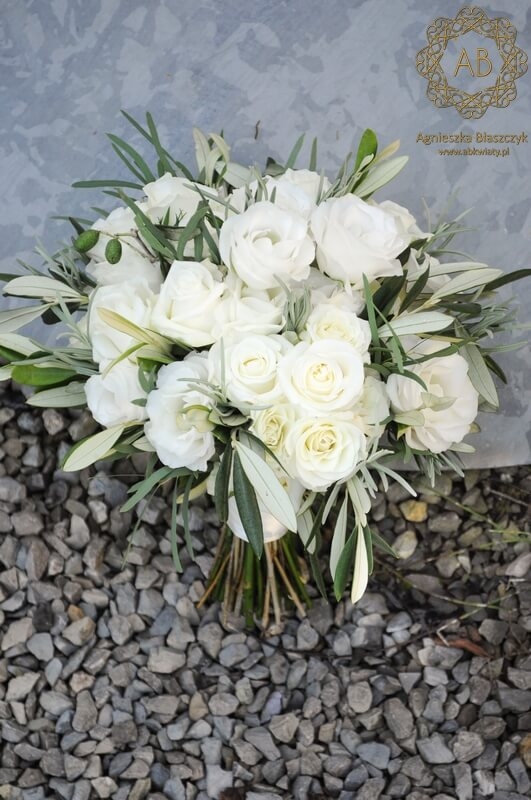 Ani zależało na prostym, eleganckim białym bukiecie ślubnym z dodatkiem oryginalej zieleni. Na jej ważny dzień przygotowałam bukiet z białych róż i eustom oraz liści oliwki i rozmarynu. Do kompletu powstał bukiet dla świadkowej oraz białe rożki z płatkami róż udekorowane zieloną wstążką i gałązkami oliwki.