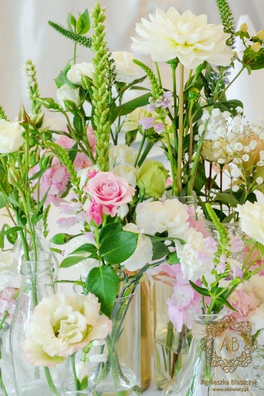 Do dekoracji sali w „Skalnym Dworze”, niedaleko Ojcowa, posłużyła masa różnej wielkości i w różnym kształcie szklanych buteleczek i wazoników wypełnionych pastelowymi kwiatami. Aranżacje z różami gałązkowymi, daliami, goździkami gałązkowymi, odętkami, liatrami, przetacznikami i hortensjami pojawiły się na stołach, parapetach oraz bufetach. Zbiór buteleczek z białymi i różowymi kwiatami witał również gości w korytarzu oraz towarzyszył przy poprawianiu makijażu w toaletach.